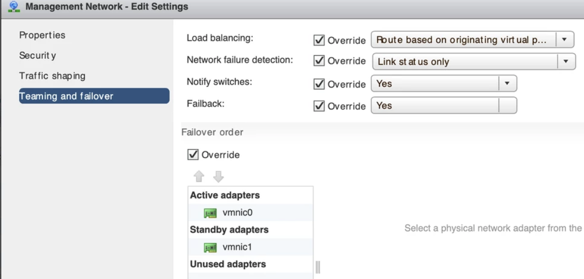 Move Down ‘vmnic1 or Desired vmnic’ from ‘Active Adapters’ group to ‘Standby Adapters’ group – Using the Blue colored up and Down arrows under Failover order section. and Click ‘OK’.
